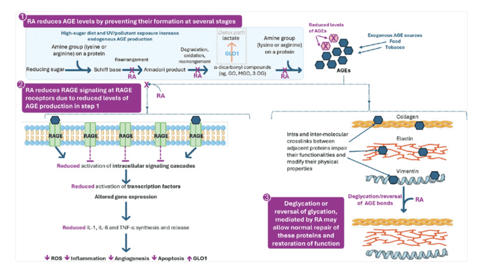 RAGE signalling – RA reduces oxidative stress and blocks RAGE activation, thereby lowering downstream inflammatory signalling and matrix degradation .